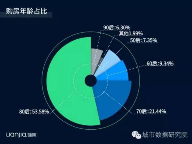 目前上海购房人群的主力是80后、70后。80后占绝对的主力,高达53.58%,70后排名第二,占21.44%。年龄段决定了购房预算与面积的走向。