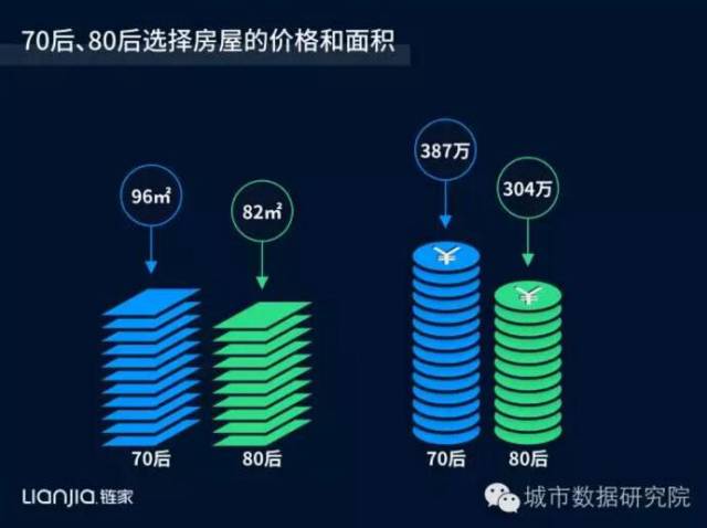 从面积上看,70后平均购房面积为96平米,80后平均购房面积为82平,80后的房屋面积比70后小了15%。从价格上看,70后平均购房价格为387万,80后的平均购房价格为304万,比70后少21%。显然,仅从刚需而言,需求层次并不高。