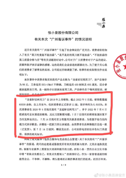 事情7月6日发生,7月7日经销商客服回复不当引发舆论关注。直到7月14日,“官方客服再次联系消费者”、“并赠送一把新刀具以表诚意”。7月18日,张小泉发布“断刀召集令”。