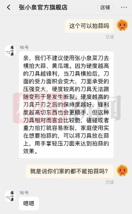 针对这件事情,不少网友跑去其他刀具旗舰店咨询了客服,双立人、苏泊尔、爱仕达的官方客服均表示不建议拍蒜,因为进行横拍的时候,会有断裂的风险。