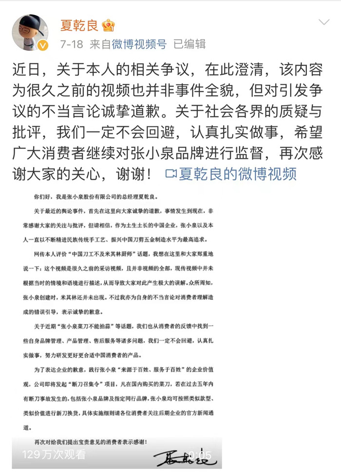 7月18日晚间,夏乾良在其个人微博道歉并予以澄清,称网传视频是很久之前的采访视频,且并非视频的全部,现传视频中并未根据当时的情境和语境进行描述,从而导致大家对此产生极大的误解,其对自己造成的错误引导表示诚挚的歉意;此外,其还提到张小泉即将发起“断刀召集令”项目,对五年内在国内购买,包括张小泉品牌及指定同行品牌在内发生过断刀事故的刀具,均按类似款型和价值进行新刀换货。