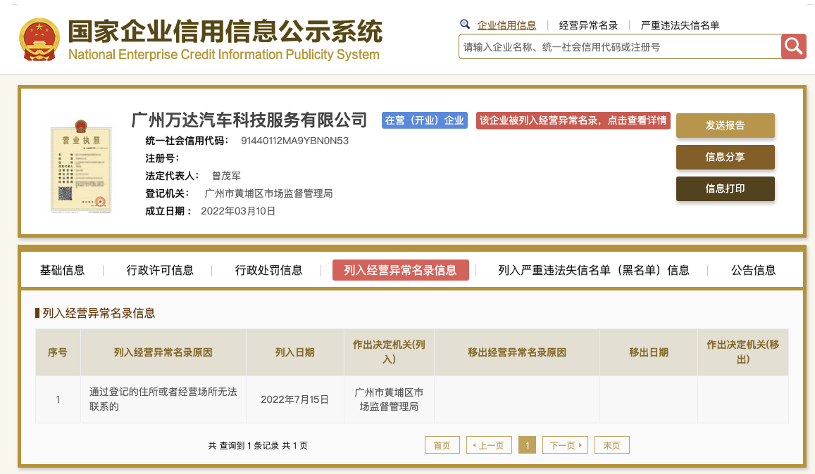 国家企业信用信息公示系统网站显示,7月15日,广州万达汽车科技服务有限公司因通过登记的住所或者经营场所无法联系,被广州市黄埔区市场监督管理局列入经营异常名录。该公司成立于2022年3月,法定代表人为曾茂军,注册资本500万人民币,由万达汽车科技服务有限公司全资控股。