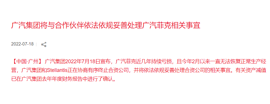 当地时间2022年7月18日,Stellantis集团在阿姆斯特丹对外发布消息称:该集团拟与广汽集团有序终止成立于 2010 年 3 月的合资企业,也就是大家所熟知的广汽菲克。