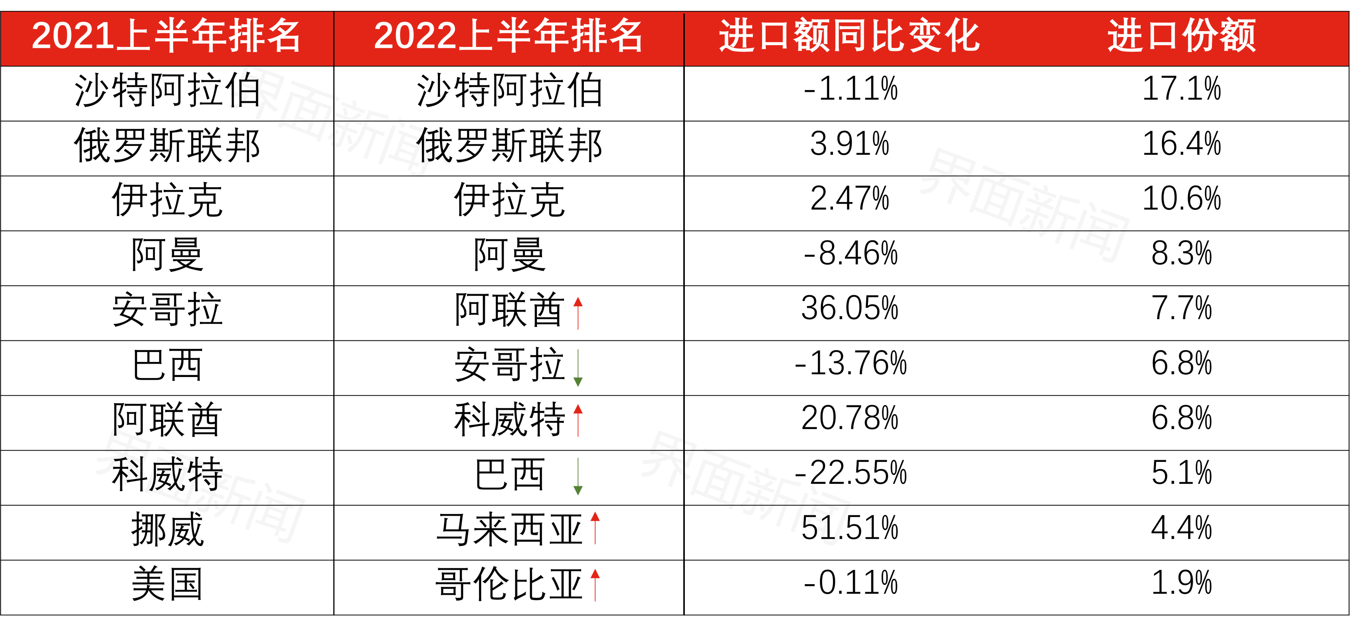 排名第四的是阿曼,上半年中国进口了该国2103万吨原油,同比下降8.46%,但排名保持不变。