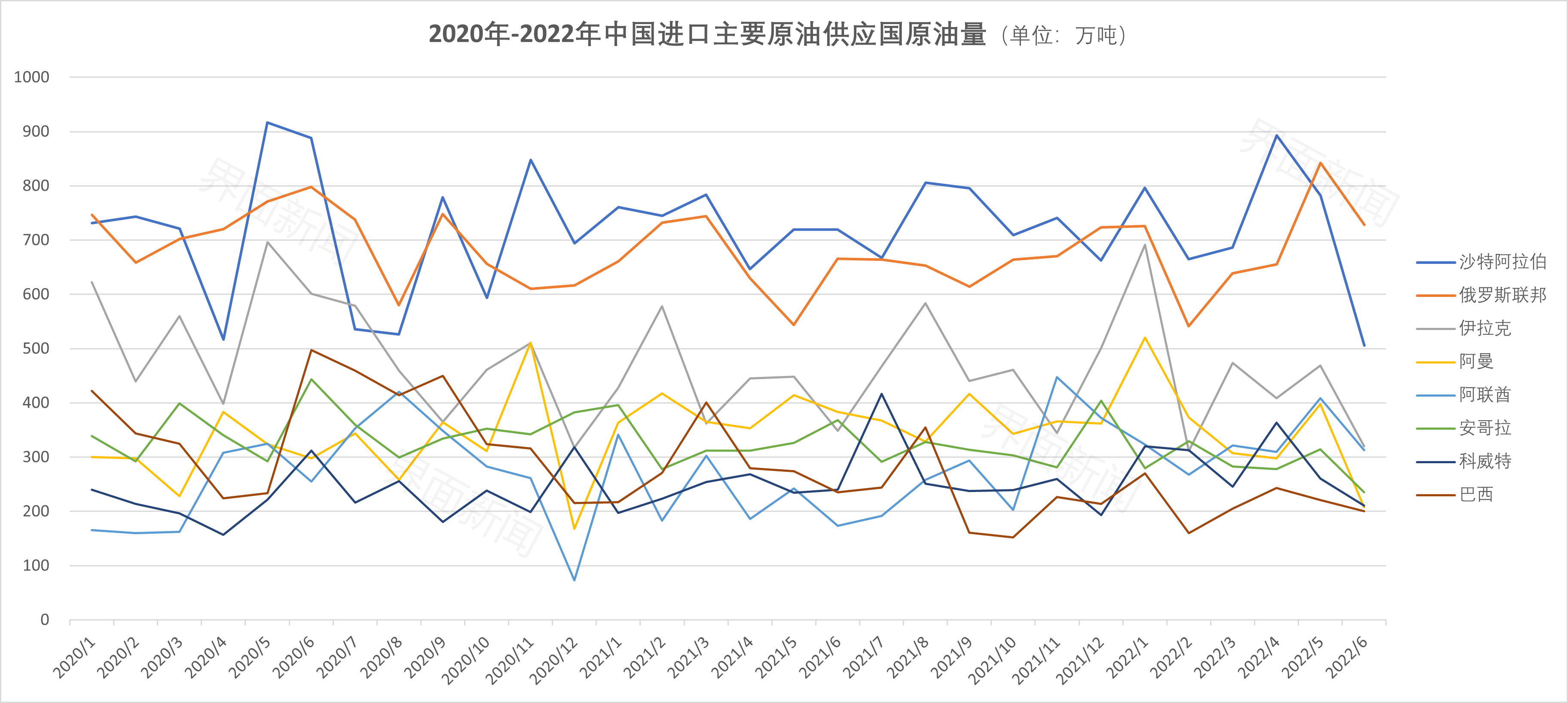 2020年1月、4月、7月、8月和10月,俄罗斯均为中国第一大原油供应国。在2020年11月开始的13个月中,沙特阿拉伯都是中国最大的原油供应国,直到2021年12月,俄罗斯的供应量再度超过沙特阿拉伯。
