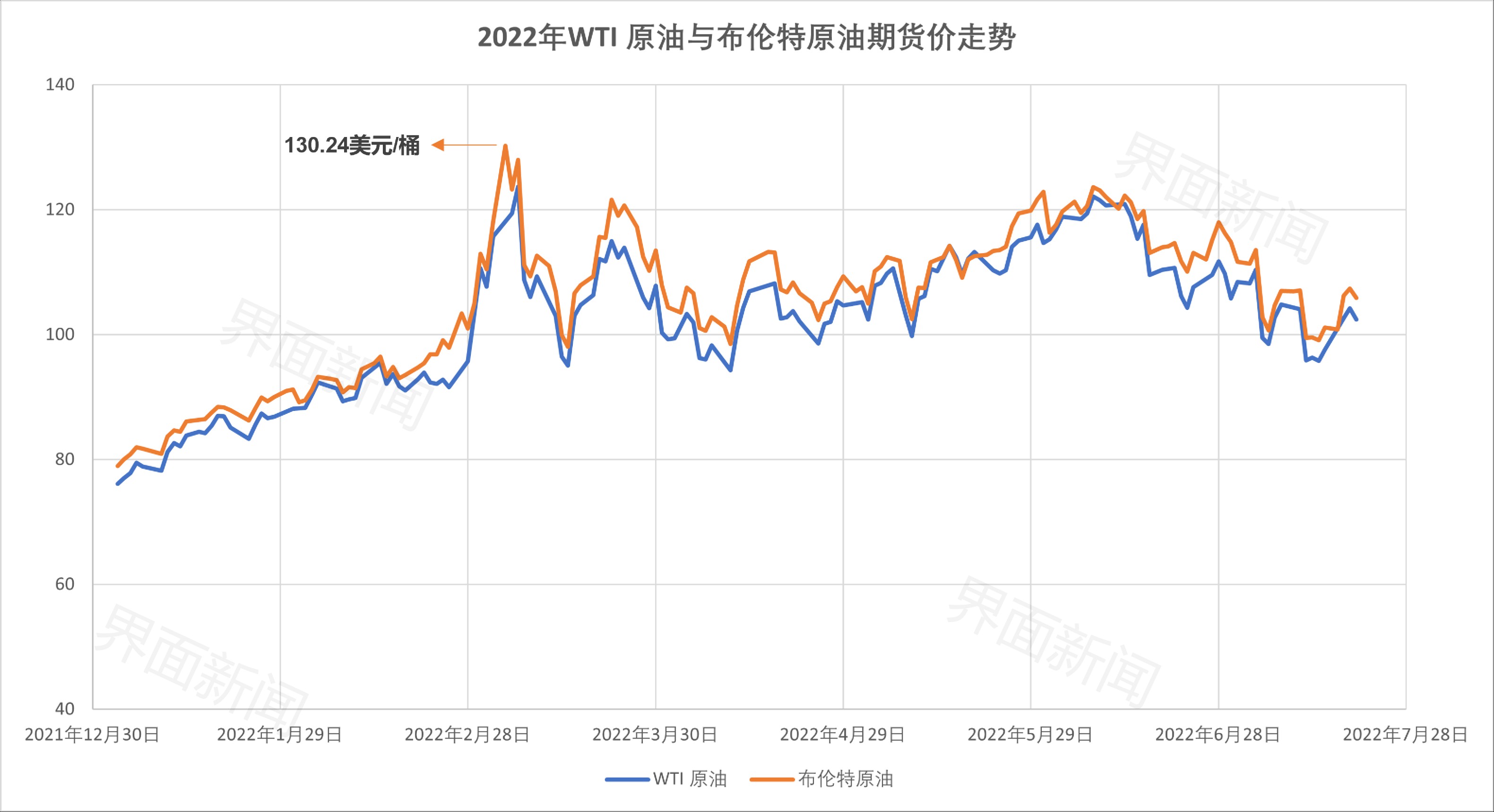 受俄乌局势升级等因素影响,2月24日,布伦特原油主力合约站上每桶100美元,刷新2014年9月以来新高。3月,国际油价一度涨超130美元/桶,随后震荡下滑至100美元附近。随着5月欧美国家夏季驾驶季节来临,以及欧洲对俄罗斯“禁油令”落地,油价再次涨至120美元/桶以上。