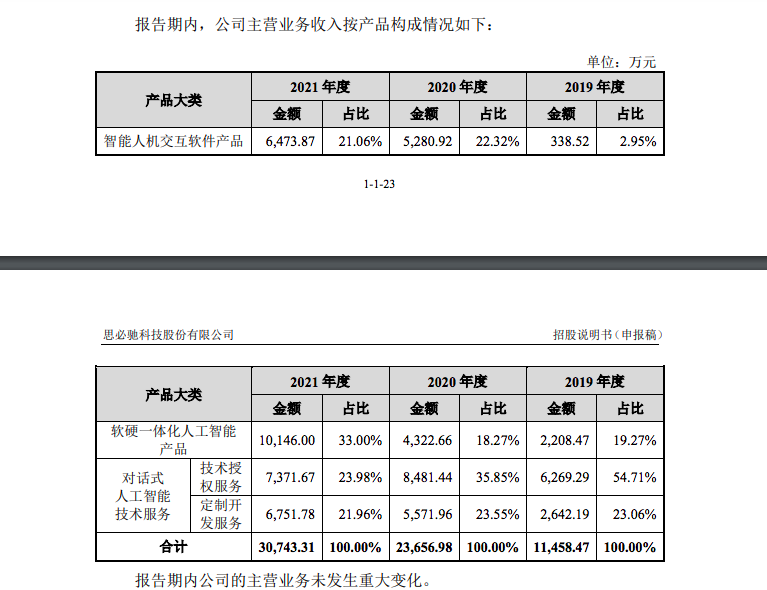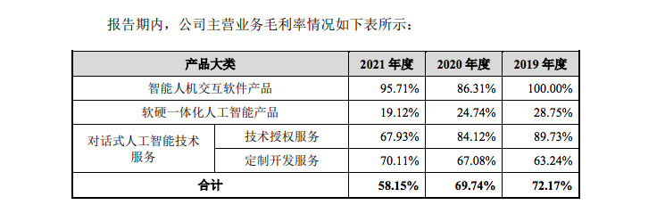 此外,另外两大主营业务对话式人工智能技术以及智能人机交互软件产品,都依赖于客户的购买套数、开通数量、调用次数、时长等多维度评判,具有订阅周期限制,因此收益水平极大程度上受到客户变动及订阅周期长短的制约。同时,毛利率最高的智能人机交互软件产品,近三年内业务占比并无明显提升,对于拉升毛利也并未做出过多影响。‘’