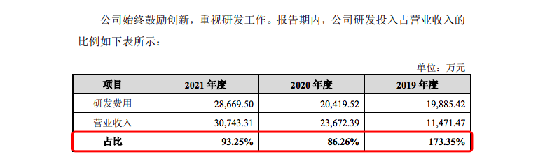 在集体亏损背后,AI科技公司的高研发投入成为罪魁祸首。以财大气粗的商汤科技为例,过去四年中,研发费用率已由2018年的45.9%一路飙涨至2021上半年的107%。思必驰也未能幸免,招股书显示,过去三年里,公司研发投入分别达到1.99亿元、2.04亿元和2.87亿元,占据营收比例达到惊人的173.35%、86.26%和93.25%。