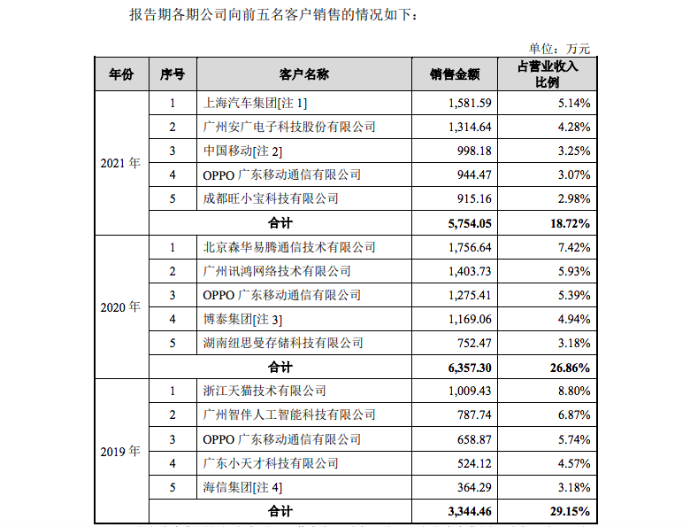 除了业务转型受挫,思必驰的招股书中还暴露了另一严重问题:报告期内头部客户频繁变动。根据招股书显示,2019-2021年,除了OPPO广东移动通信有限公司稳定处在前五客户销售席位中,且金额较为稳定,其他大客户均在三年间不断轮换,且第一、二位大客户三年间均只出现过一次。