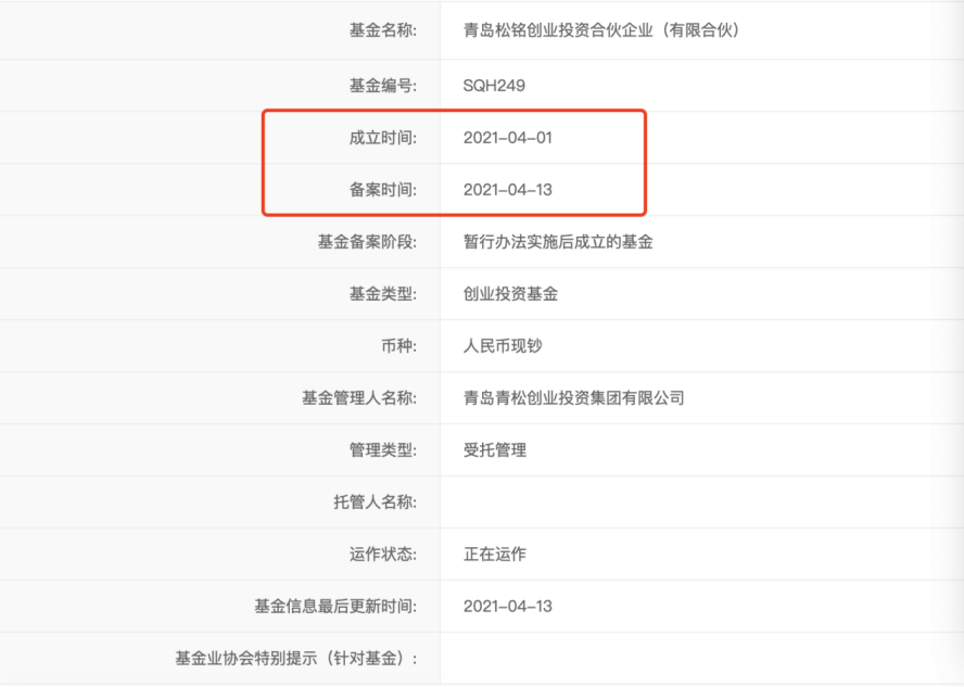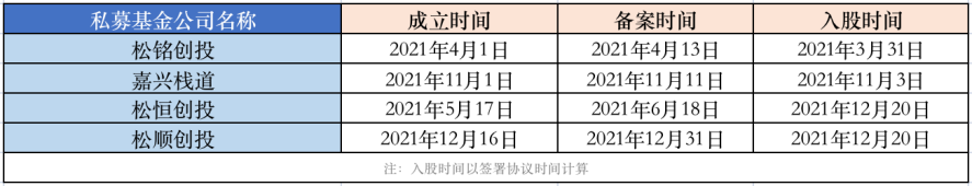 具体来看,2021年3月31日,青岛青禾股东松嘉创投决定将代持的84.95万股青岛青禾股份转让给松铭创投。而中国证券投资基金协会数据显示,松铭创投2021年4月1日才成立,4月13日完成备案。