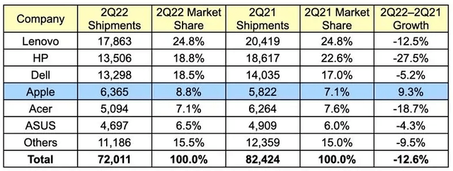 市场研究与顾问公司Gartner7月11日发布的数据显示,2022年第二季度,全球PC发货总量为7200万台,比2021年第二季度下降了12.6%,创9年来最大跌幅。其中,中国市场PC出货量下降了16%,在区域市场中下滑幅度仅仅略好于EMEA(欧洲、中东和非洲地区)的18%。