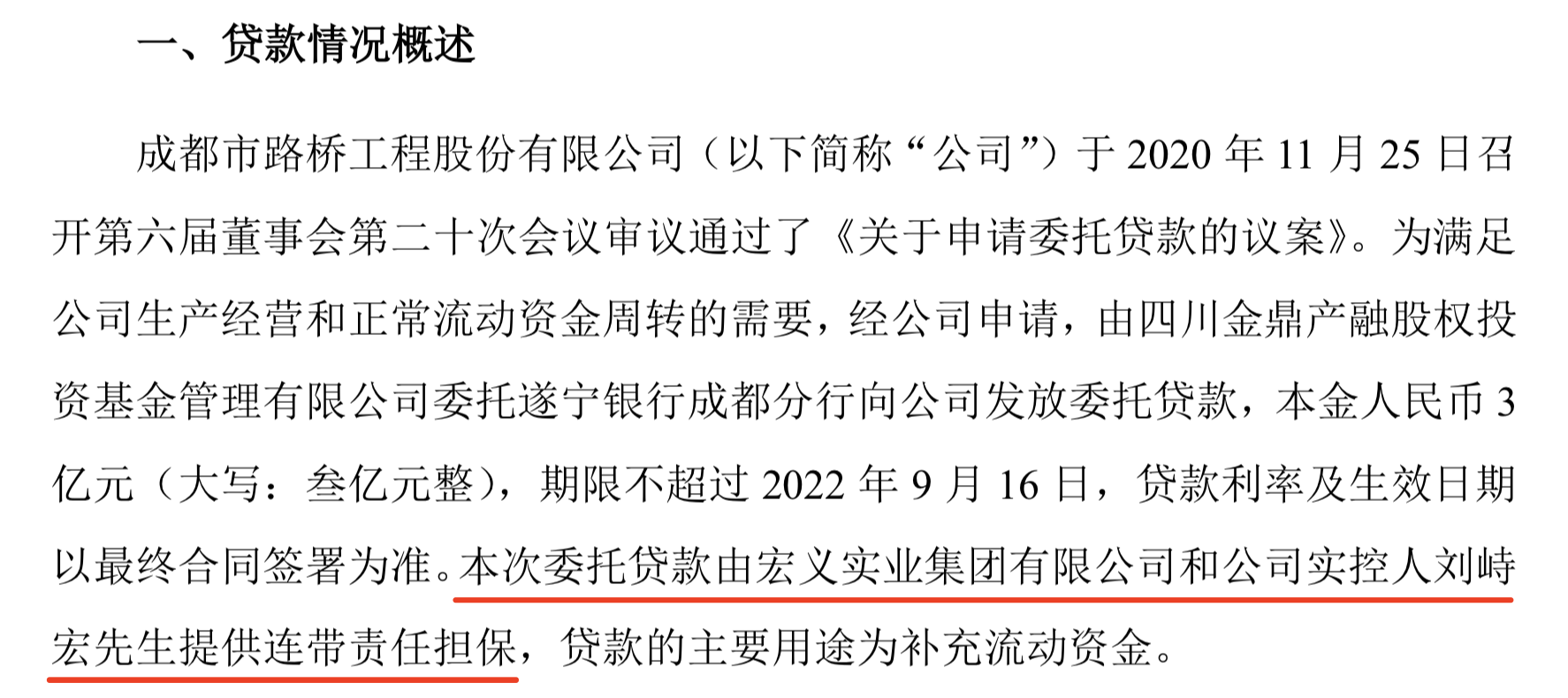 2020年11月,为补充流动资金,成都路桥申请由四川金鼎产融股权投资基金管理有限公司(简称“四川金鼎”)委托遂宁银行成都分行向成都路桥发放了3亿元委托贷款,期限不超过2022年9月16日。