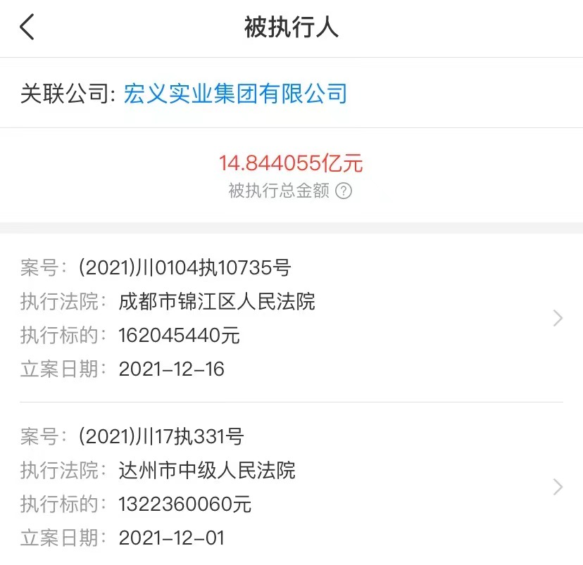 同在7月19日晚间,成都路桥称,四川宏义发展集团有限公司(简称“宏义发展”)撤销了对宏义嘉华的破产重整申请,宏义嘉华与宏义发展就债务偿还事项已达成一致意见。公开资料显示,宏义发展在2022年3月28日被最高人民法院公示为失信公司,宏义嘉华在2022年6月28日被四川省成都市中级人民法院列为被执行人。