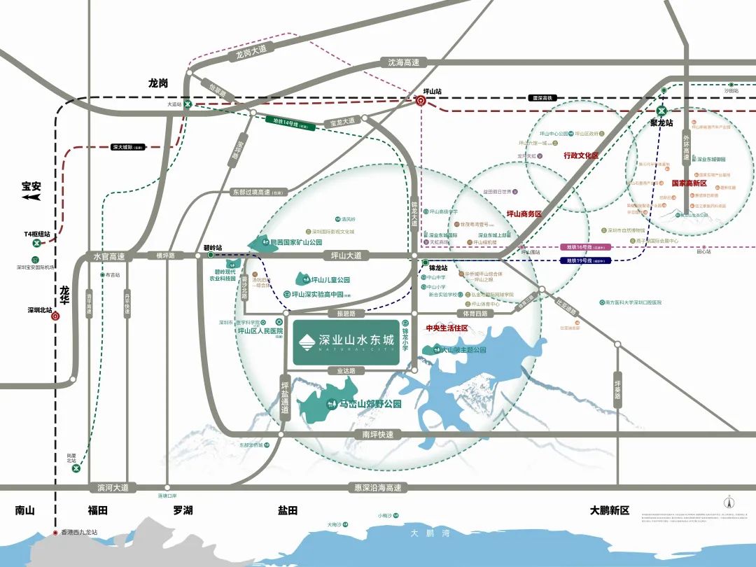 深业山水东城位于坪山区碧岭街道锦龙大道和振碧路的交汇处西南角,周边聚集了不少工业园区,直线1.3公里内还有已经开盘的玖誉雅筑。