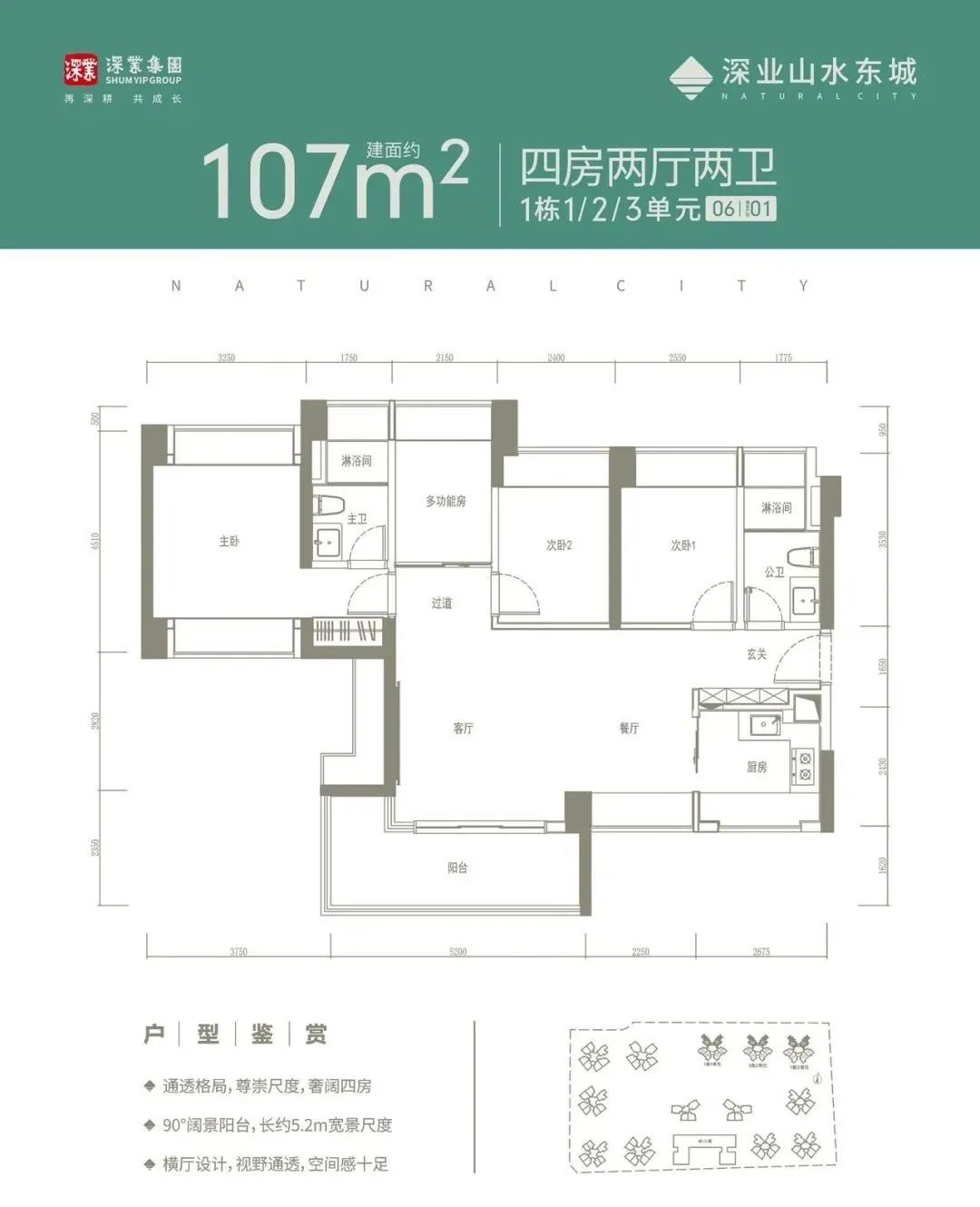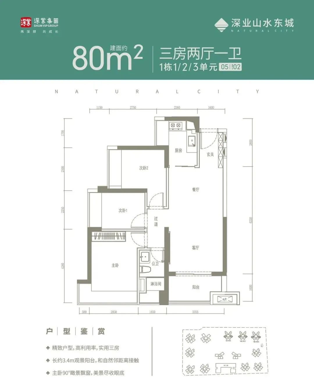 此次深业山水东城主推80-107平方米的户型,共设置了三个面积段户型,全部位于项目的1栋。