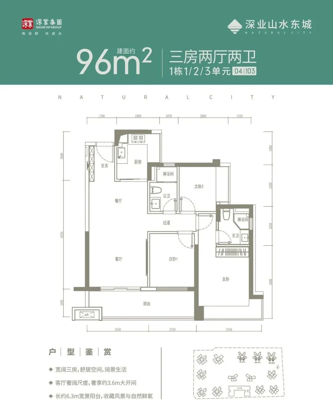 该面积段户型为三房两厅两卫,同时配备一个长6.3米的大阳台,可连通客厅和卧室。