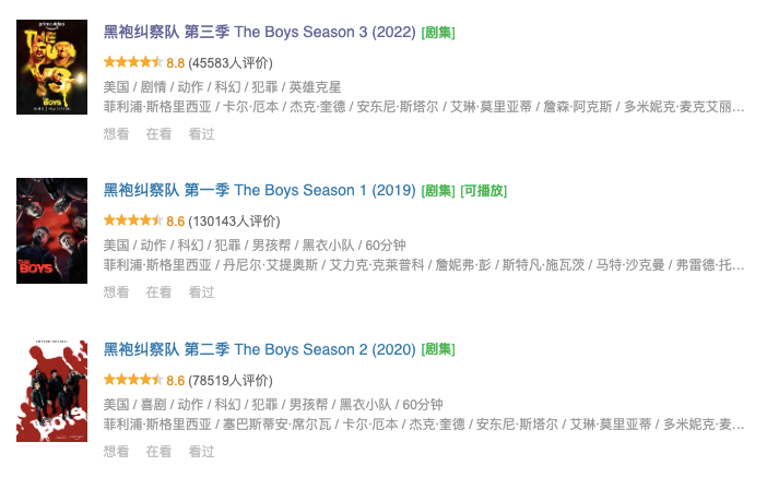 反英雄的内核、暴力直白的台词和视听感官冲击、对流行文化的嘲弄……《黑袍纠察队》从上线以来就呈现出了全然不同于常规漫改影视剧的气质。在IMDb2020年最受欢迎的十大电视剧评选中,该剧直接排到了第一名,而前两季在豆瓣也获得了8.6分的不错成绩。今年6月第三季上线,开局时国内外口碑一片好评,豆瓣评分一度高达9.4分,但随着第八集结局放出,该剧豆瓣评分已经下滑到了8.8分。