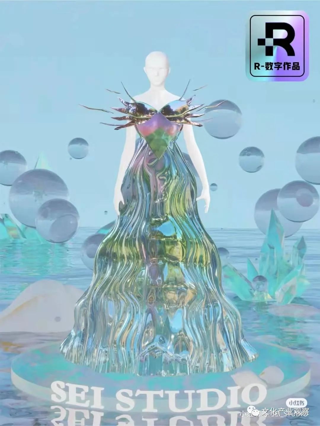 除此之外,虚拟服饰,顾名思义是虚拟的,是存在于虚拟世界的,这也就意味着人们可以不受现实世界的各种约束,可以长出花瓣的帽子、反重力倒流的水晶、水蓝色的美人鱼大尾巴、悬浮在半空的玫瑰花瓣......在这里,你可以找到各种天马行空的服装和配饰,大胆、夸张,也更吸引眼球。
