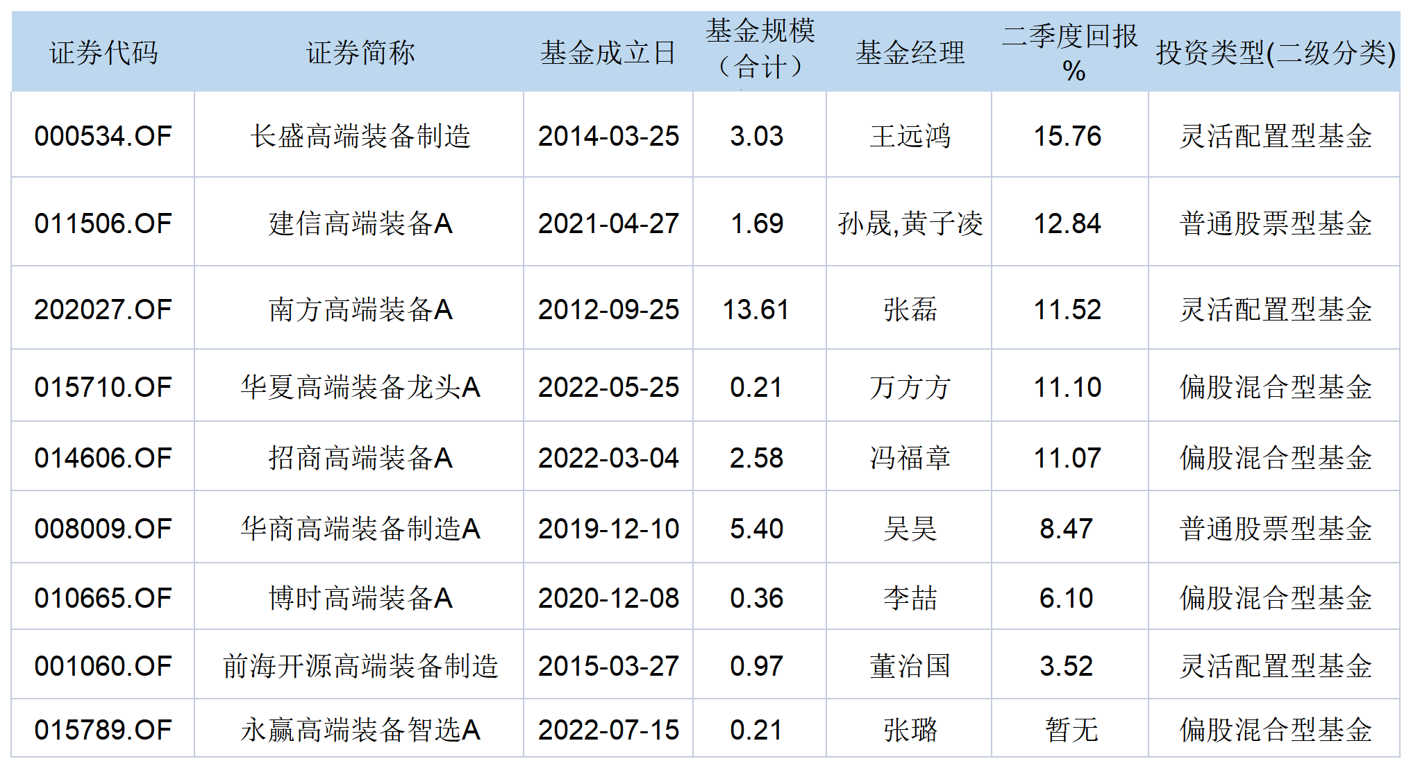 Wind数据显示,目前共有9只高端装备主题基金。从二季度回报率来看,王远鸿管理的长盛高端装备制造为15.76%,孙晟、黄子凌管理的建信高端装备为12.84%,冯福章管理的招商高端装备为11.07%,位于第5位。