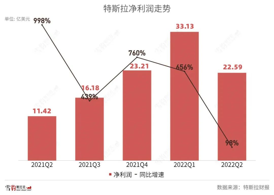 作为最赚钱的新能源车企,特斯拉在二季度的净利润增长也显著放缓。财报显示,特斯拉经调整后净利润22.59亿美元,近5个季度以来首次失去三位数增速,同比增长98%,环比下降32%。