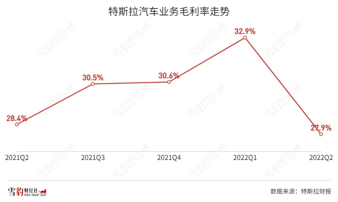 特斯拉连续11个季度盈利背后,全靠高毛利支撑。2022年一季度,特斯拉汽车毛利率高达32.9%。但二季度,这一数字降至27.9%,这还是在特斯拉产品数次涨价之后。