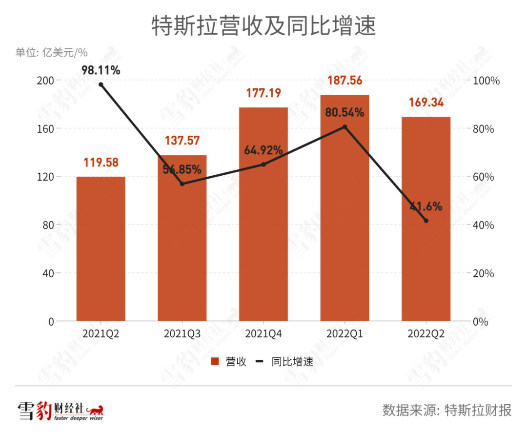 北京时间7月21日,美股周三盘后,特斯拉发布2022年第二季度财报:营收同比上涨41.6%至169.3亿美元,低于市场预期;净利润同比上涨98%至22.59亿美元,高于市场预期。