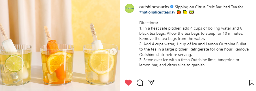 Outshine能够在高手如林的美国冰品市场上脱颖而出,绝不仅仅靠琳琅满目的产品,事实上,他也是一位社交营销的高手。在这个颜值至上的时代,Outshine产品的靓丽色彩无疑为其加分许多,极高的色彩饱和度更加吸引年轻人,集合式的大包装也更能满足社交需求,成为好友相聚、共享快乐的上佳产品。同样,品牌对外的自我宣传也是彰显社交属性的一部分,在国际友谊日这类利于社交分享的时刻,品牌总会活跃在社交平台第一线,用文字的力量鼓励人们分享美味与健康,辅助刻画年轻形象。