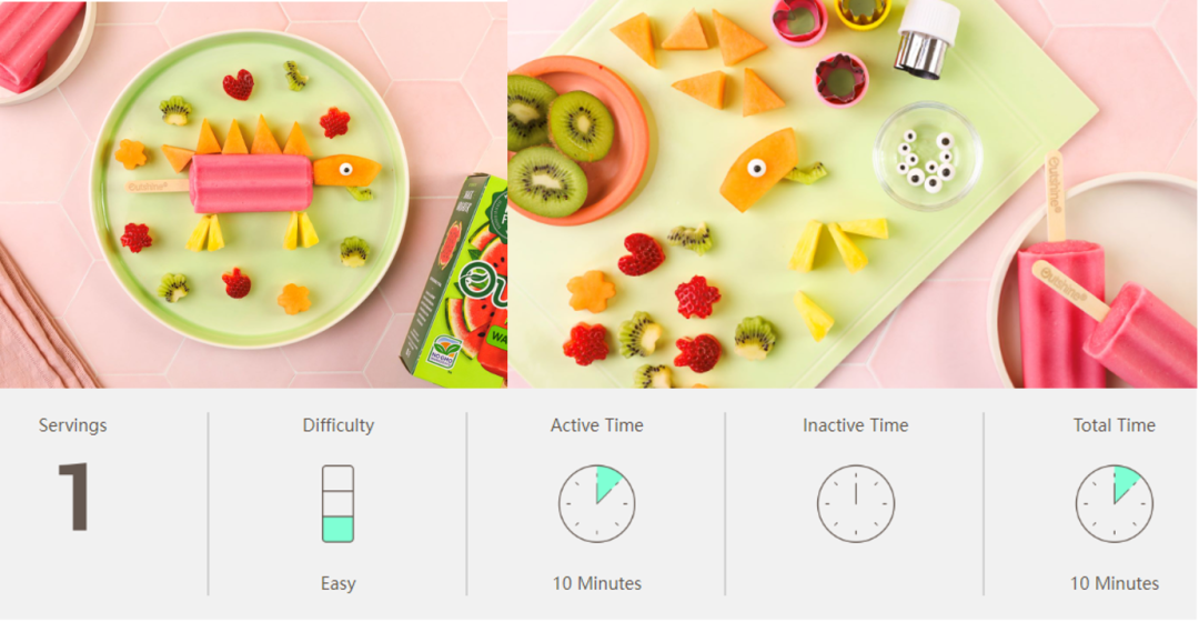 甚至是一些亲子时刻,Outshine bar也能毫不突兀的融入其中,简单的DIY制作成为假期陪伴孩子的小游戏。在Outshine官网上,展示了大量食谱,从拿铁到适合全家的早餐碗,甚至是卡通动物果盘都会展示出详细的制作原料及方法,包括分量、难度、所需时间。不仅如此,这些食谱覆盖的年龄圈层和适用场景也很全面,融入到生活的方方面面,发掘更多的可能性。