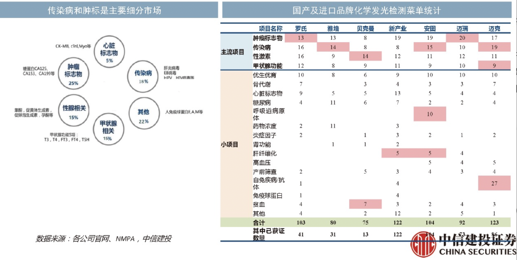 免疫诊断试剂兼具灵敏性与精准性,被称为检验科的“摇钱树”,化学发光是其中的主流技术,市场占比接近90%,基本所有国内三甲医院都有发光套餐项目,如肿标、性激素、甲功、贫血、代谢等。对于普通人而言,常规体检单子上较为大额的肿瘤标志物检测项目,就属于化学发光技术。