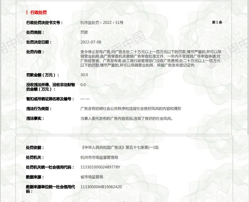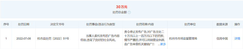 近日,聚美丽记者在天眼查官网发现,今年3月因涉嫌低俗广告语导致营销翻车的脱毛仪品牌Ulike,被杭州市市场监督管理局处罚30万元。