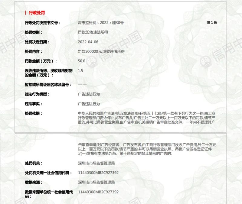 除了由莱科技外,承担播放该广告职责的上海定向广告传播有限公司深圳分公司,早在4月份时已受到行政处罚。其与由莱科技合作所产生的广告违法行为,被深圳市监局罚款50万元并没收违法所得1.5万元,金额总计51.5万元。