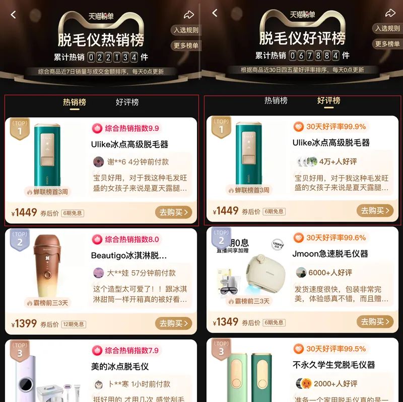 不过,与此同时,记者搜索天猫脱毛仪七天热销榜和好评榜,发现该类目榜单第一位仍然是Ulike蓝宝石冰点脱毛仪,且已蝉联榜首3周。此款脱毛仪的售价为2559元,天猫店铺月销达1w+。