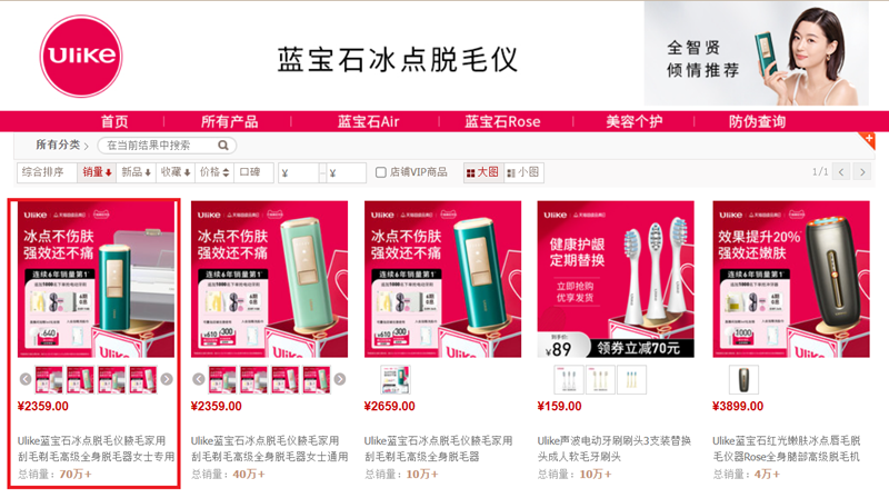 据了解,Ulike品牌成立于2016年,代言人有韩国女星全智贤、国内女星景甜等。记者搜索天猫官方旗舰店页面发现,其显示店铺销量第一的蓝宝石冰点脱毛仪总销量已达70w+。