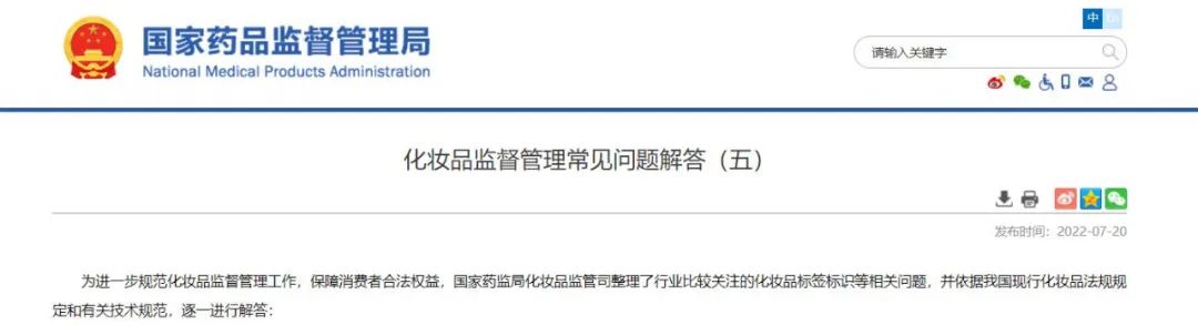 今日(7月20日),国家药品监督管理局发布了化妆品监督管理常见问题解答(五)(下称解答),其中针对行业比较关注的化妆品标签标识等相关问题,依据我国现行化妆品法规规定和有关技术规范,逐一进行了解答。