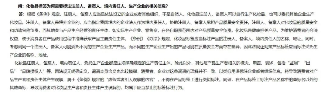 解答明确指出,化妆品注册人、备案人、境内责任人、受托生产企业都是法规明确规定的生产责任主体。除此以外,其他与产品生产者相关的概念、用语、表述,包括“监制”“出品”“品牌授权人”等,不得在产品标签上进行类似标注。
