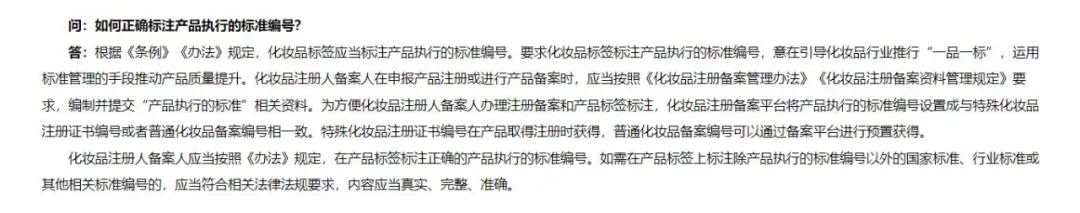 与此同时,对于“执行标准号”,解答也做了明确答复:如需在产品标签上标注除产品执行的标准编号以外的国家标准、行业标准或其他相关标准编号的,应当符合相关法律法规要求,内容应当真实、完整、准确。