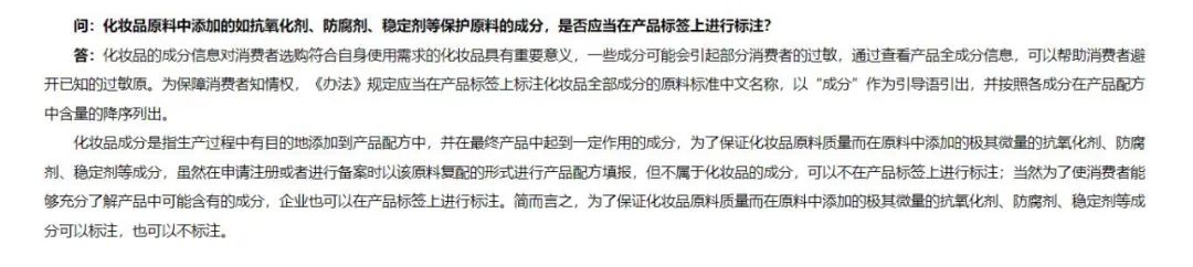 解答指出,为了保证化妆品原料质量而在原料中添加的极其微量的抗氧化剂、防腐剂、稳定剂等成分,虽然在申请注册或者进行备案时,以该原料复配的形式进行产品配方填报,但不属于化妆品的成分,可以不在产品标签上进行标注;当然为了使消费者能够充分了解产品中可能含有的成分,企业也可以在产品标签上进行标注。