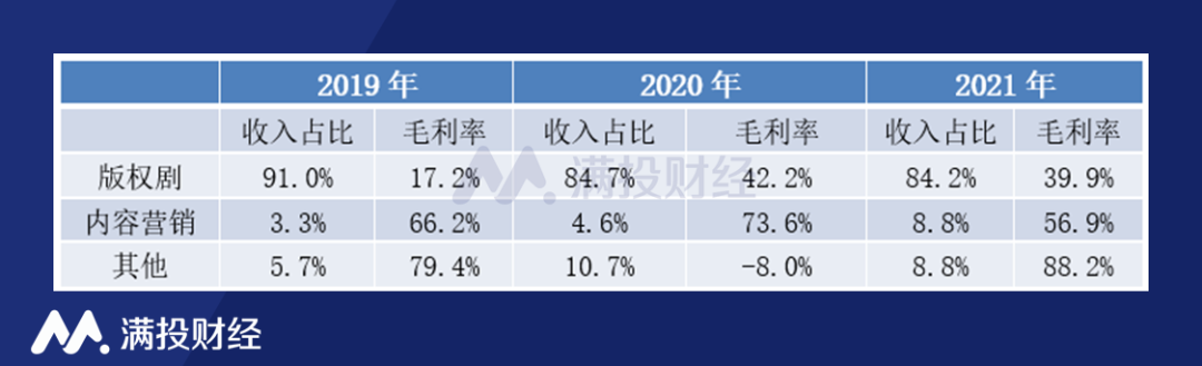 版权剧的播放向授权平台收取版权费是公司的主要收入来源,占公司总收入的80%以上,但制作不同类型的剧集其成本差异较大,因此公司版权剧的毛利率波动较大。内容营销主要为向客户收取的广告服务收入;其他业务主要包括定制剧集制作、改编授权费、艺人经纪服务等;内容营销和其他这业务的收入占比较小,但毛利率较高,这两块业务收入占比的提升一定程度上拉高了公司的毛利率水平。