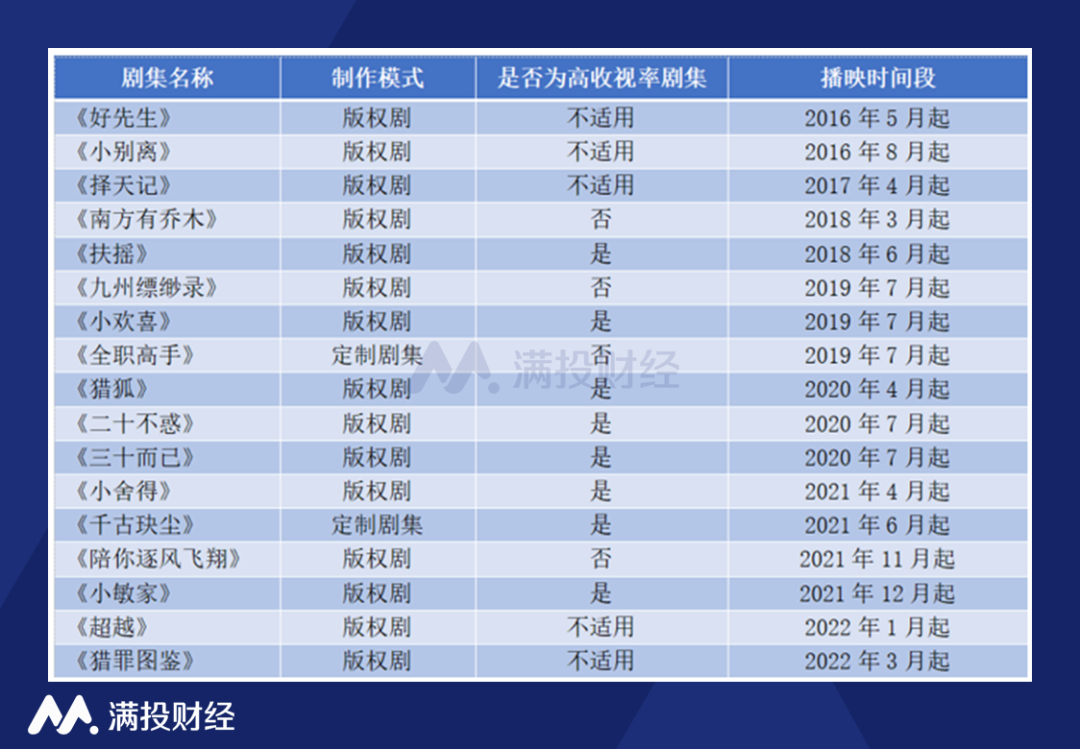 从公司具体投资制作的剧集来看,公司成立以来一共制作了17部剧集,其中有15部版权剧,涵盖都市情感、英雄主义、古装及现实生活等一系列热门主题。
