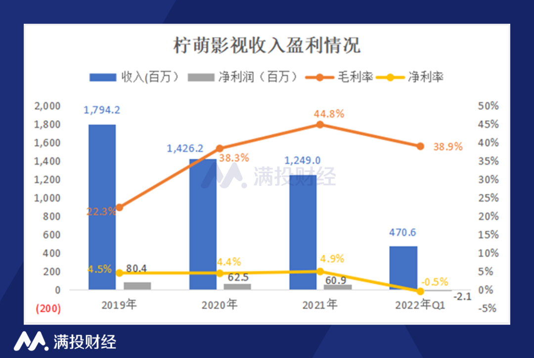 从收入来看,2019年至2021年以及2022年一季度,柠萌影视的营收分别为17.9亿元、14.2亿元、12.5亿元和4.7亿元,公司近三年的收入呈明显的下滑趋势,影视公司的收入受其投资制作的剧集的成本、数量、确认播放时间等影响较大。