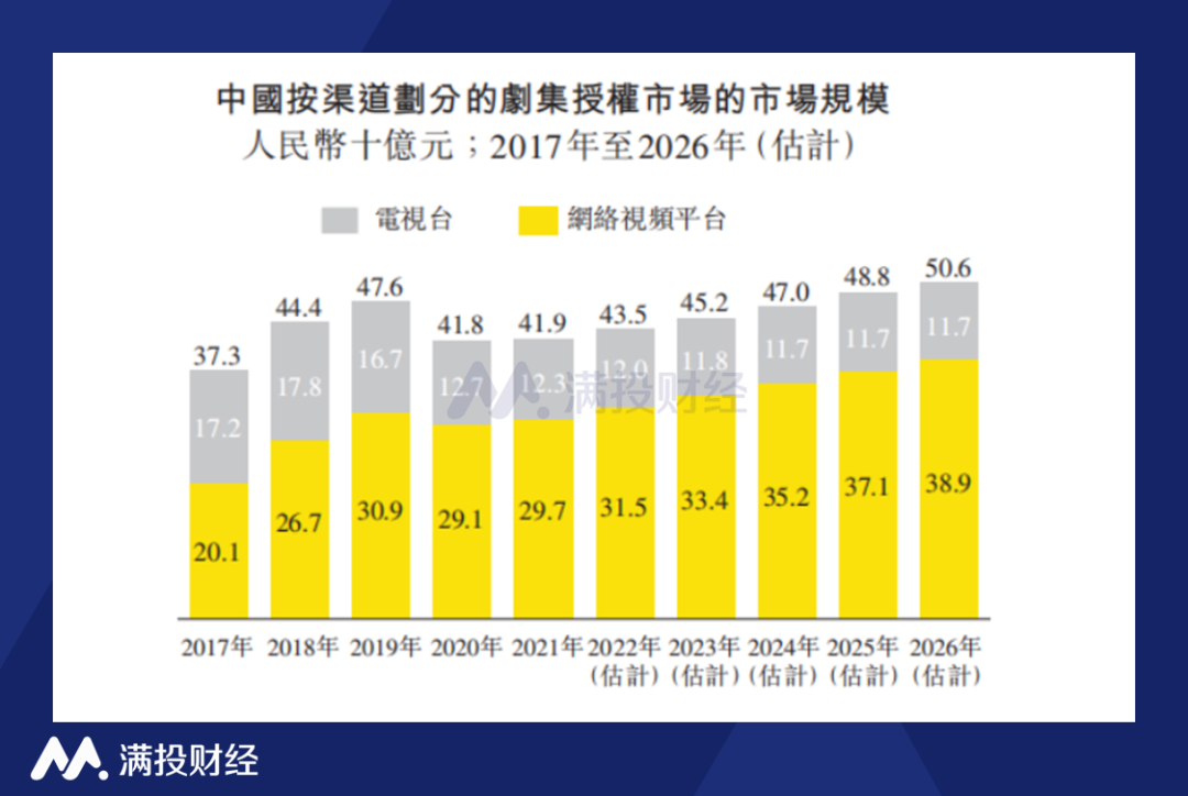 根据弗若斯特沙利文报告,2021年,中国剧集授权市场的规模达到人民币419亿元,2017年至2021年的复合年增长率为2.9%,预期到2026年将达到人民币506亿元,2021年至2026年复合年增长率预期为3.8%。其中,2021年网络视频平台的剧集授权市场规模为297亿元,电视台的剧集授权市场规模为123亿元。