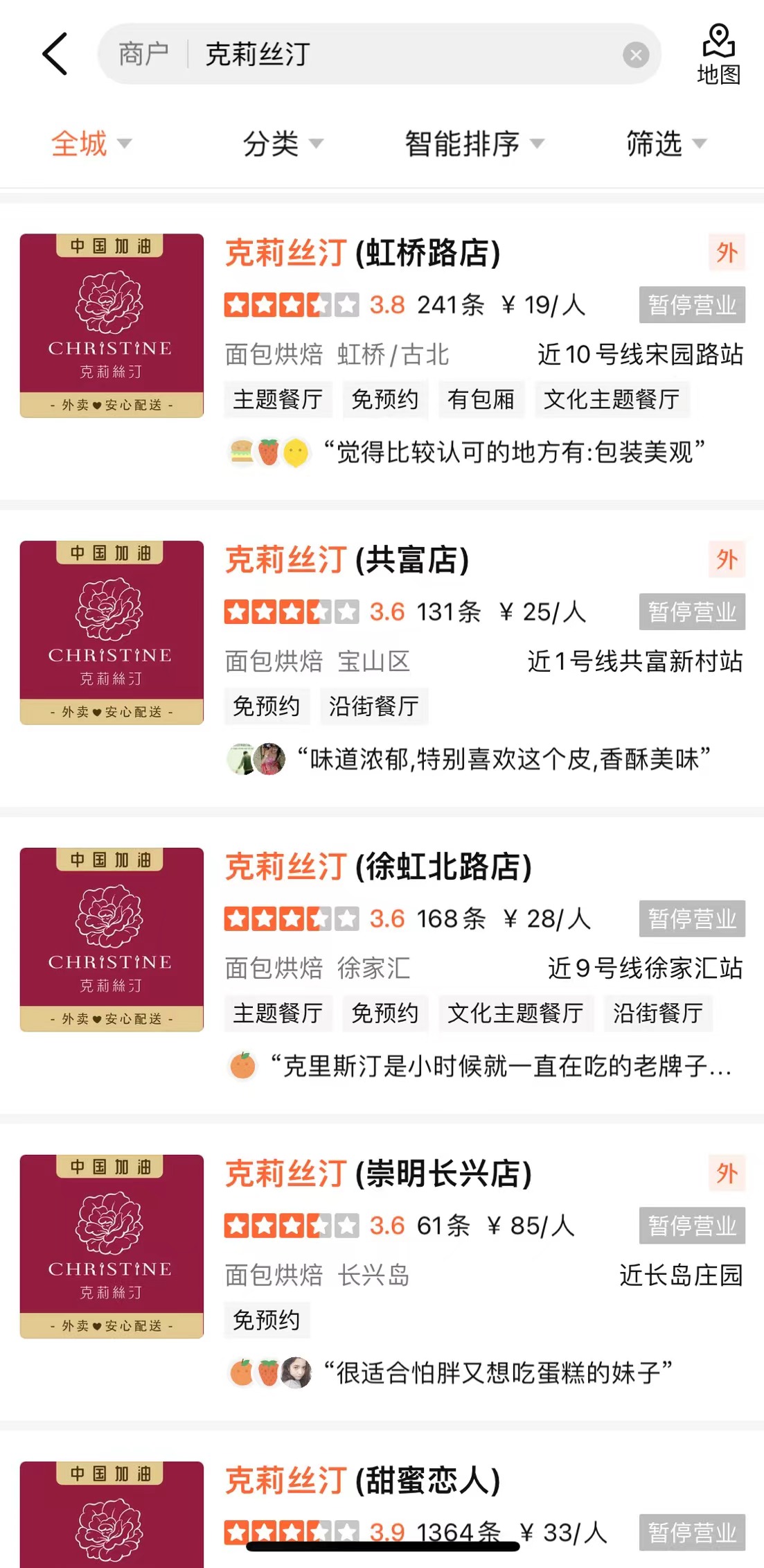 7月21日界面新闻在大众点评搜索显示,克莉丝汀在上海的几乎所有门店都显示暂停营业状态。上海之外,克莉丝汀也关闭了部分位于南京的门店。据窄门餐饮数据显示,克莉丝汀目前门店数仅为279家,巅峰时期其在全国有1000多家门店。