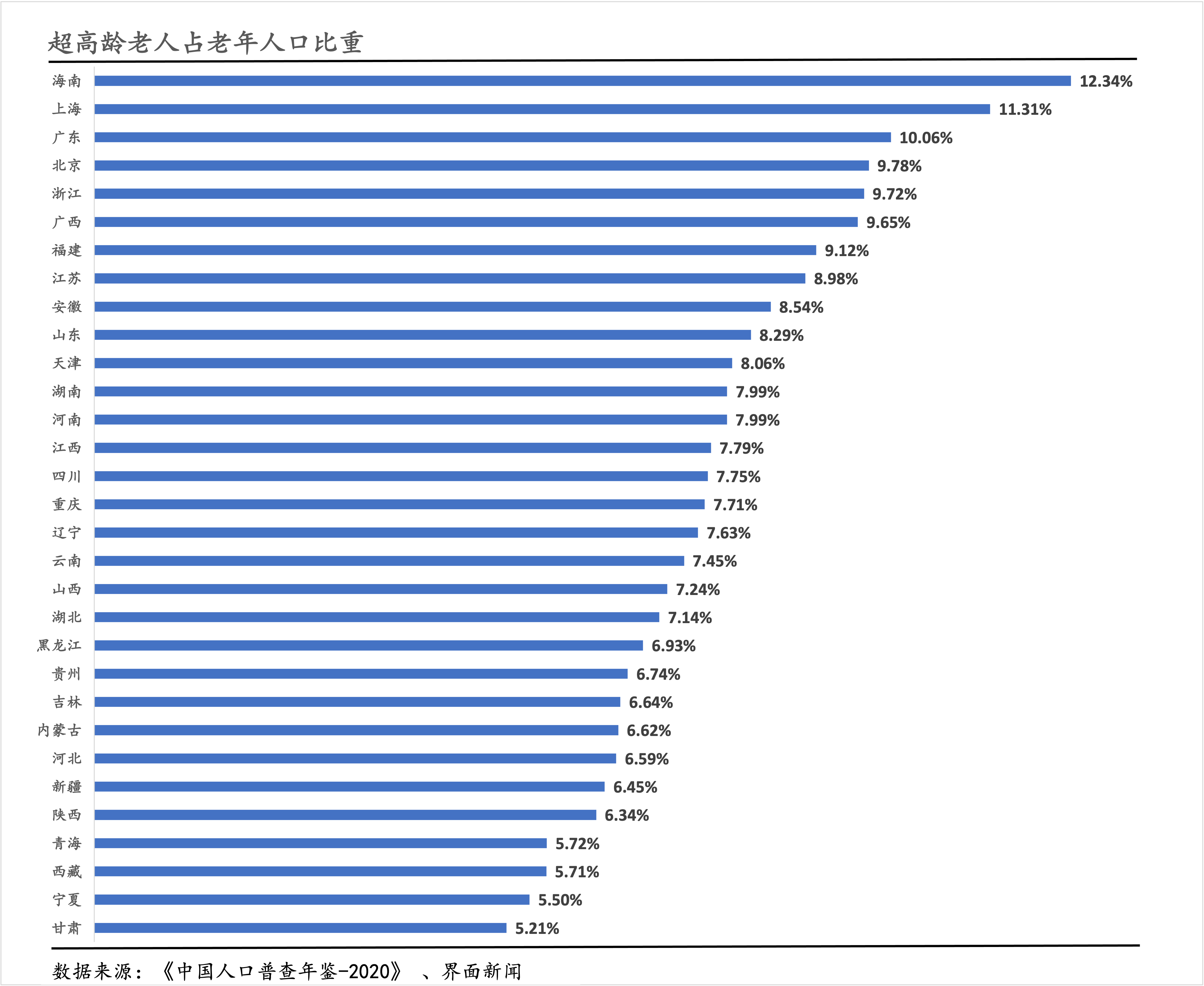 此外,随着社会经济发展,卫生医疗水平的提高也在客观上促进了人口长寿,2020年,85岁及以上超老龄人口占老年人口(65岁及以上)的比重较十年前增加1.7个百分点至 8.1%。其中,气候适人、环境舒适的海南省超高龄老人比例最高,85岁及以上年龄人口占老年人口的比重超过12%。经济发达的上海、广东两地这一比重也都超过10%。
