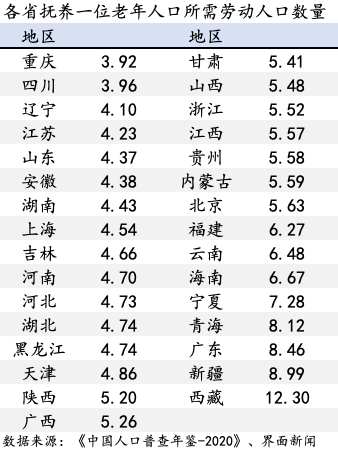 一方面,老年人口抚养比和老龄化程度高度正相关,老龄化程度深的地区,年轻人“养老”负担也重,重庆和四川的老龄化程度在全国分列第二、三位。而老龄化程度较轻的地区,年轻人“养老”负担也较轻,比如,西藏、新疆、广东这三地,一位老年人可由至少八名年轻人来抚养。