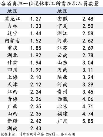 养老保险抚养压力最轻的是广东,平均六位在职人员供一位退休人员;福建和北京表现也不错,平均4.7名在职人员供养一位退休人员。