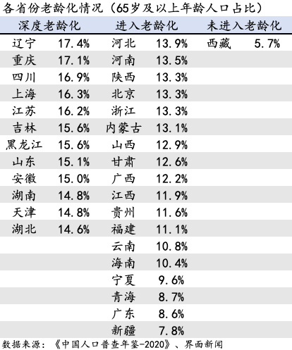 在进入深度老龄化社会的12个省份中,除了东北地区的“黑吉辽”三省,东部省份有4个,中、西部分别有3个和2个。