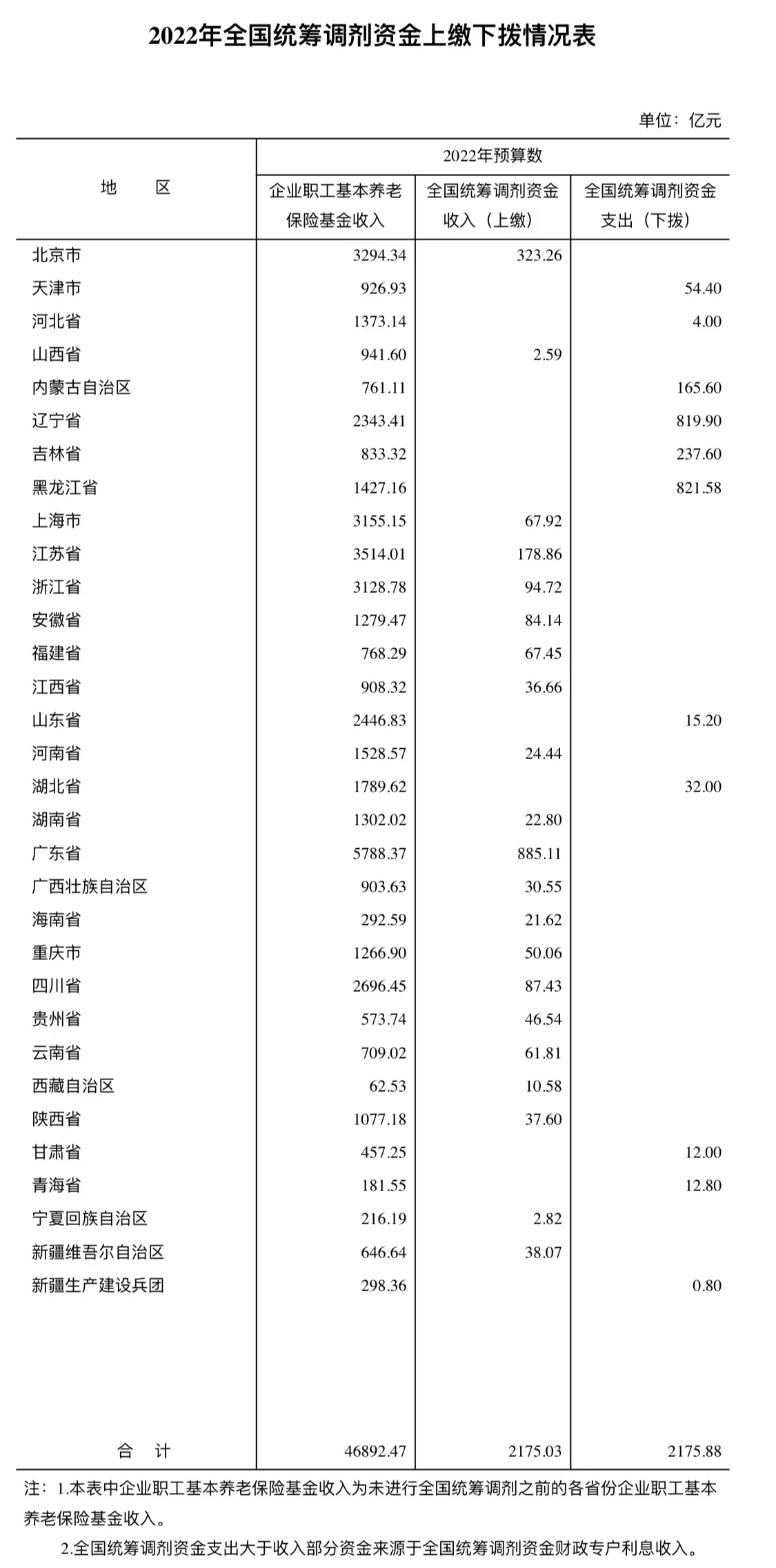 比如,2022年,养老金中央调剂金规模达2175亿元。其中,上缴全国统筹调剂资金收入的有21个省份,包括广东、北京、上海、江苏、浙江、山西、安徽、福建、江西、湖南、河南、广西、海南、重庆、四川、贵州、云南、西藏、陕西、宁夏、新疆。广东贡献最多,达到885亿元。