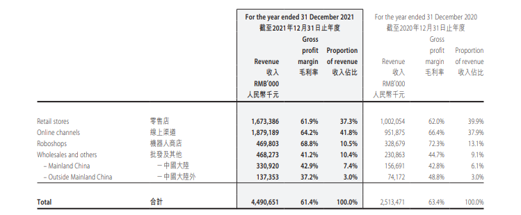 而曾经红极一时的自动贩卖机的强势在于没有店租和人力成本制约,以泡泡玛特的自动贩卖机来看,2021年其机器人商店的毛利率为68.8%,与2020年72.35的毛利相比有所下滑,与2019年的70.7%也有所差距。潮玩第一股也在面临毛利下降的问题,更不用说其他布局的品牌。如果在毛利上能够与泡泡玛特比肩,其他品牌或许也能由此翻身。