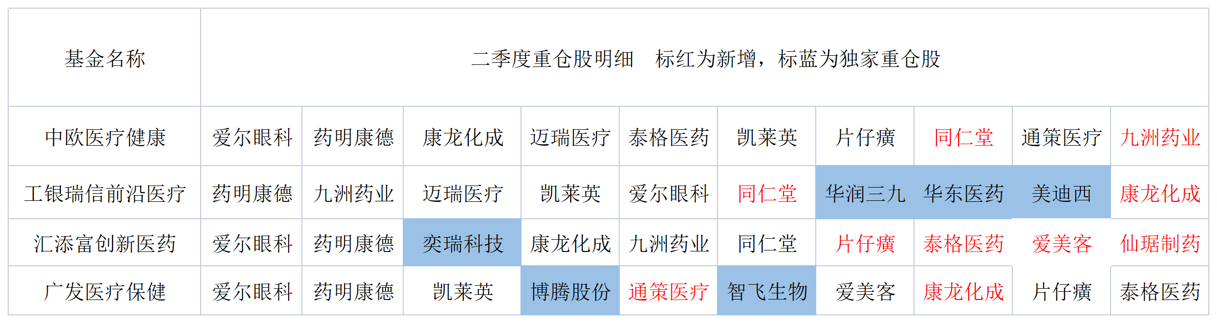 对比统计上述四只医药医疗主题基金的二季度重仓股,可以发现,除了葛兰受制于规模因素外,其余三位基金经理均有自己的“独门重仓股”。
