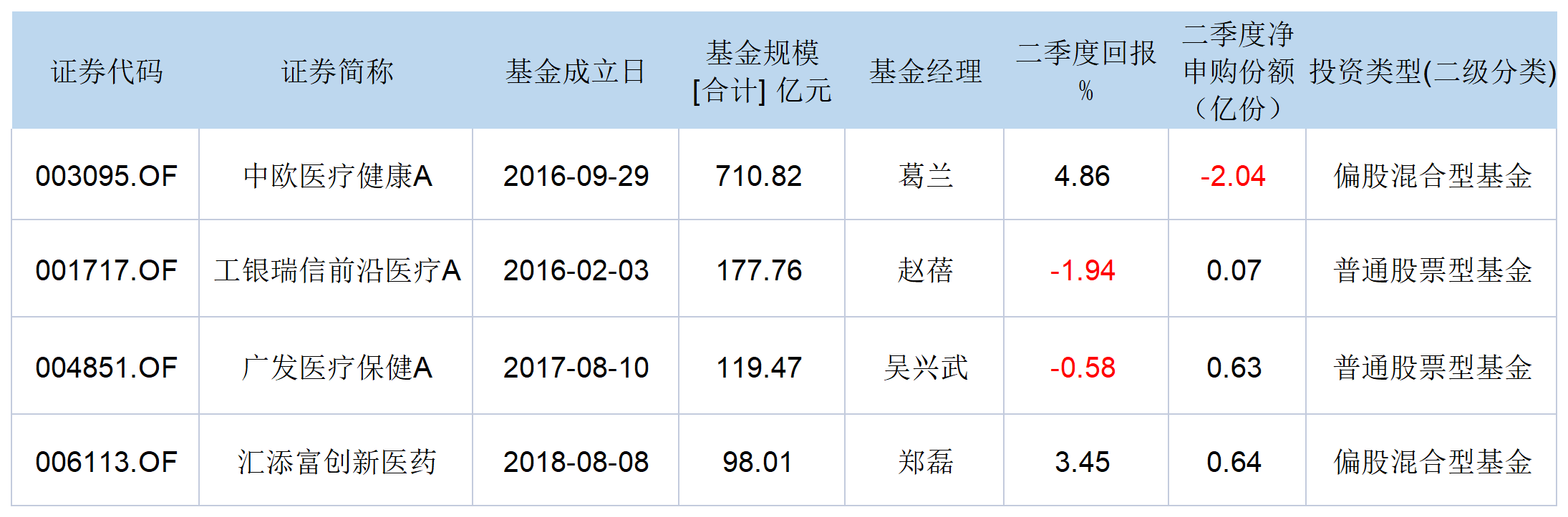 从二季度的业绩来看,四只医疗主题基金的收益均较为平淡。汇添富创新医药回报率为3.45%,而工银瑞信前沿医疗、广发医疗创新回报率则为负。